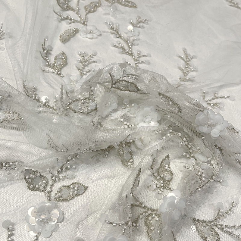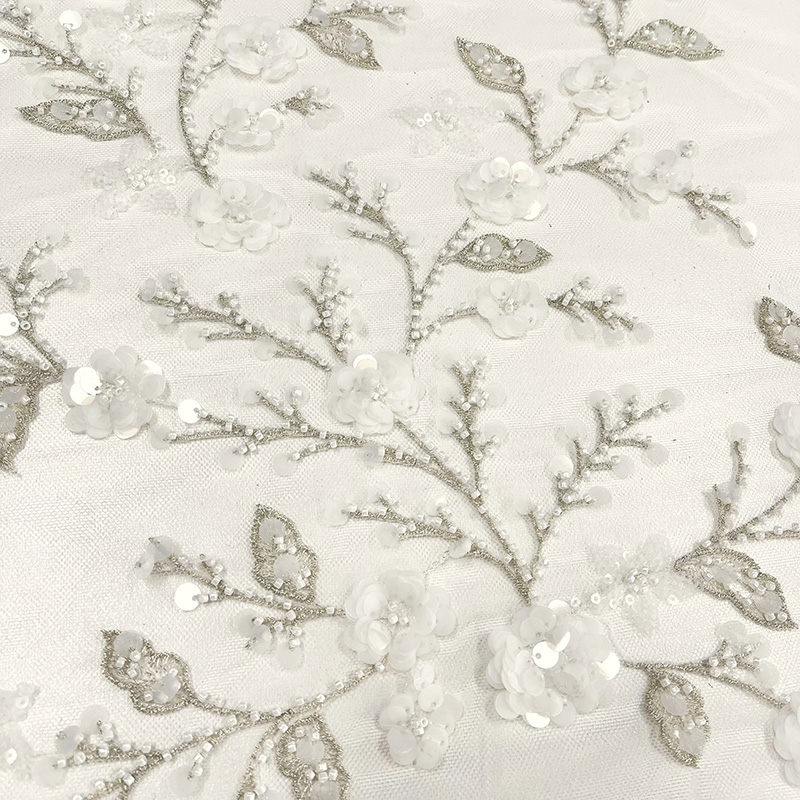 This exquisite fabric showcases intricately embroidered leaves paired with beaded and sequined flowers in a lurex silver thread. Perfect for bridal and occasion wear