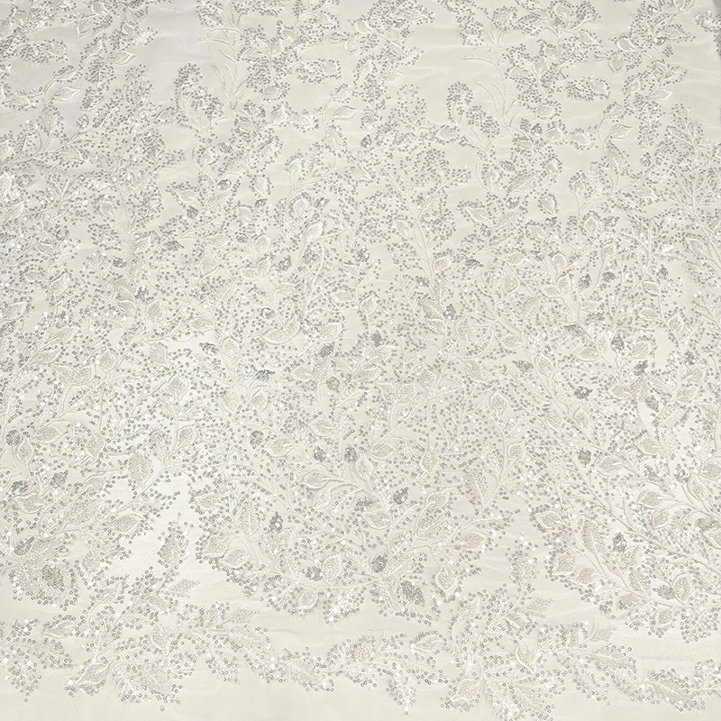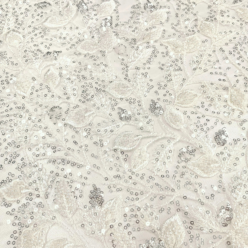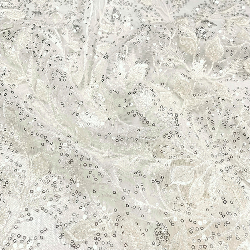 This elegant fabric features delicately embroidered leaves, embellished with beads and sequins. Perfect for bridal and occasion wear