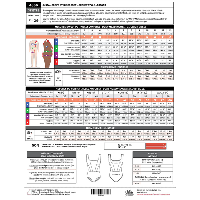 Sewing pattern for a lined sleeveless square-neck leotard. Use add-ons and other patterns in our Mix n' Match collection (sold separately on jalie.com) to transform the Odette into a dress, a unitard or simply to replace the briefs with a style with less coverage.