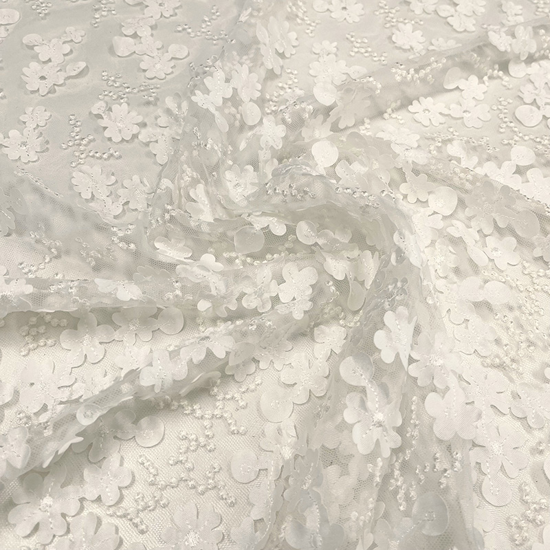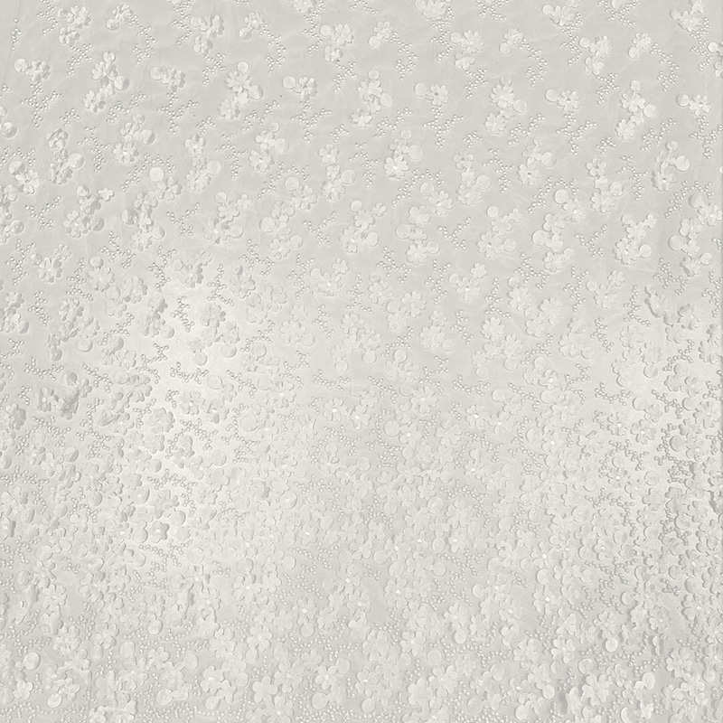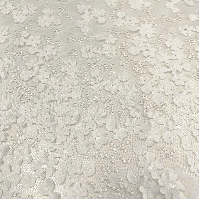 This charming fabric features delicate 3D daisy flowers that add soft texture and dimension across the surface. Complemented by fine, intricate embroidery, the design creates a balanced blend of detail and lightness. Perfect for bridal and occasion wear