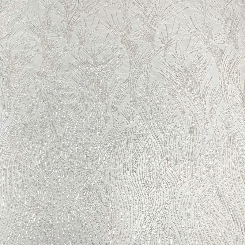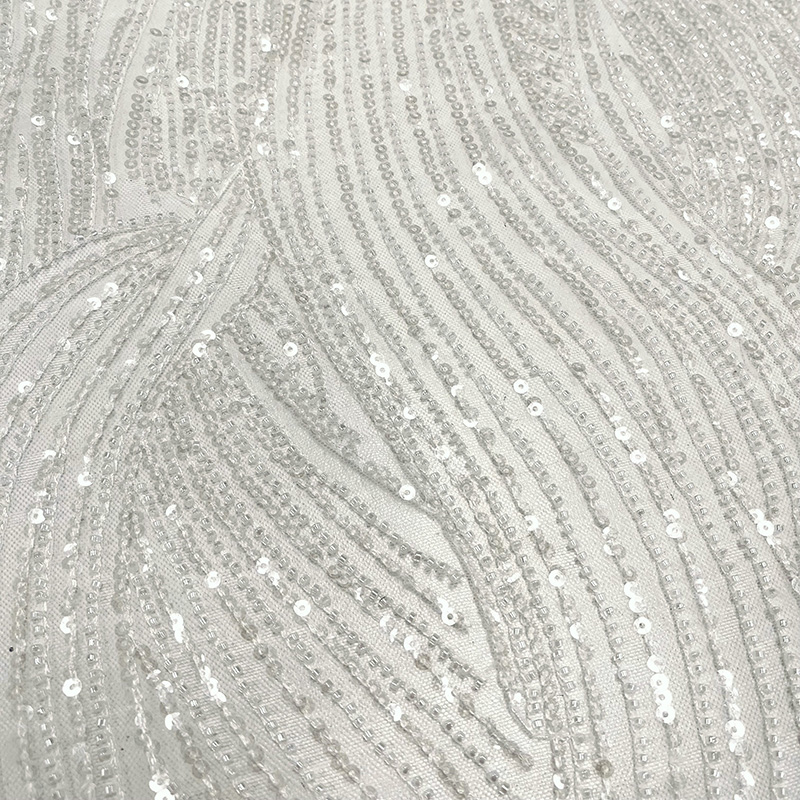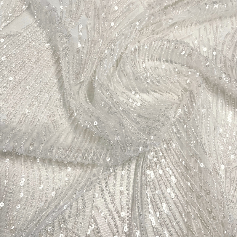 A delicate tulle fabric which features a beautifully embroidered pattern of soft waves and graceful arches Intricately woven sequins are throughout the embroidery adding a subtle, luminous shimmer. Perfect for bridal and occasion wear this fabric brings refined sophistication with a touch of sparkle.